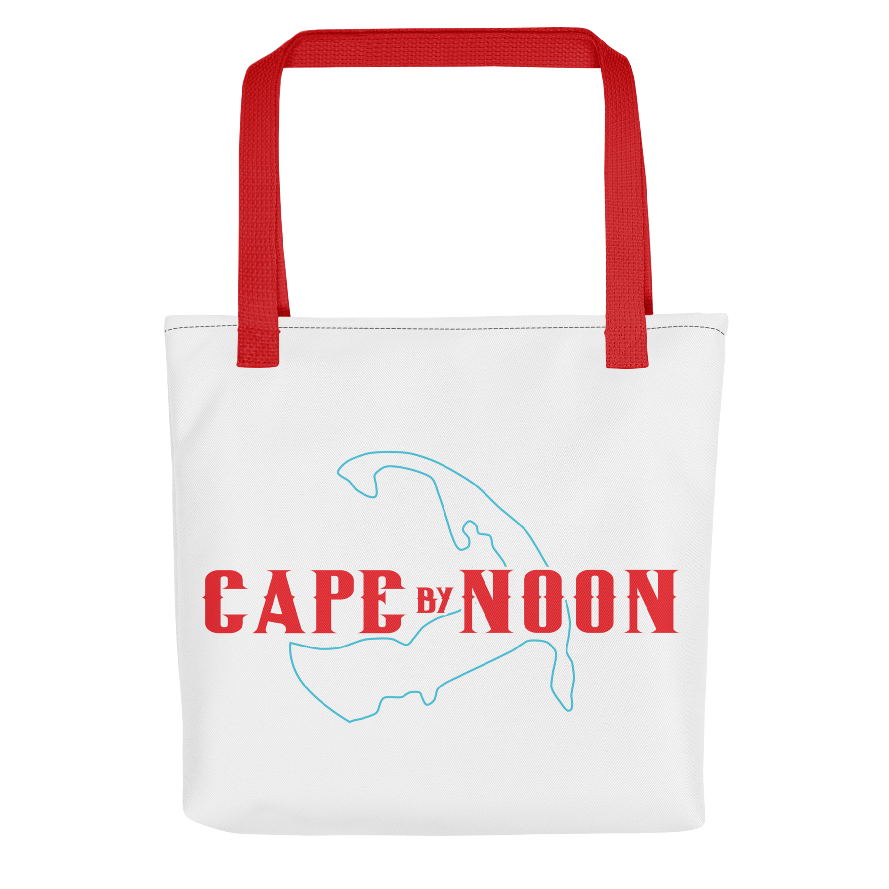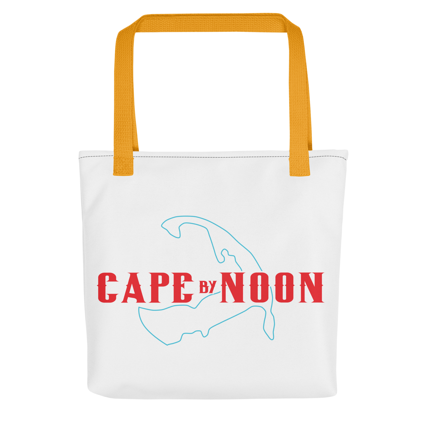 Outline of Cape Cod, with "Cape by Noon" printed above. Red, white, and blue design. Available with yellow, black, and red straps on white polyester bag. Product details: